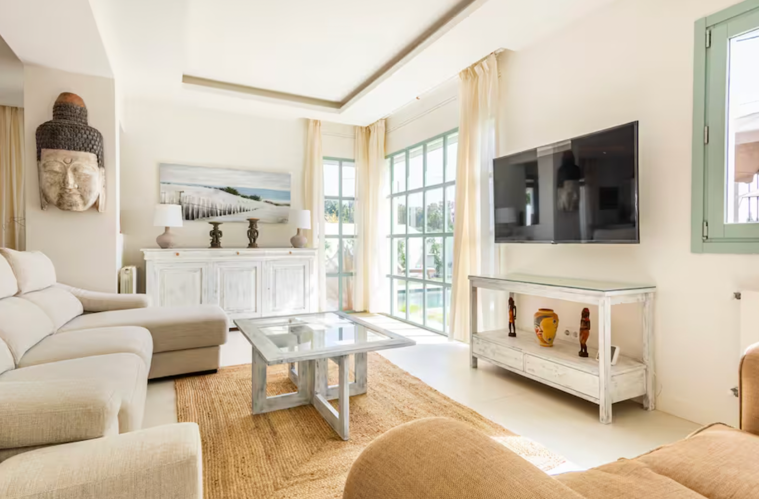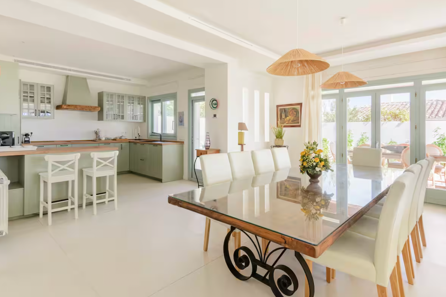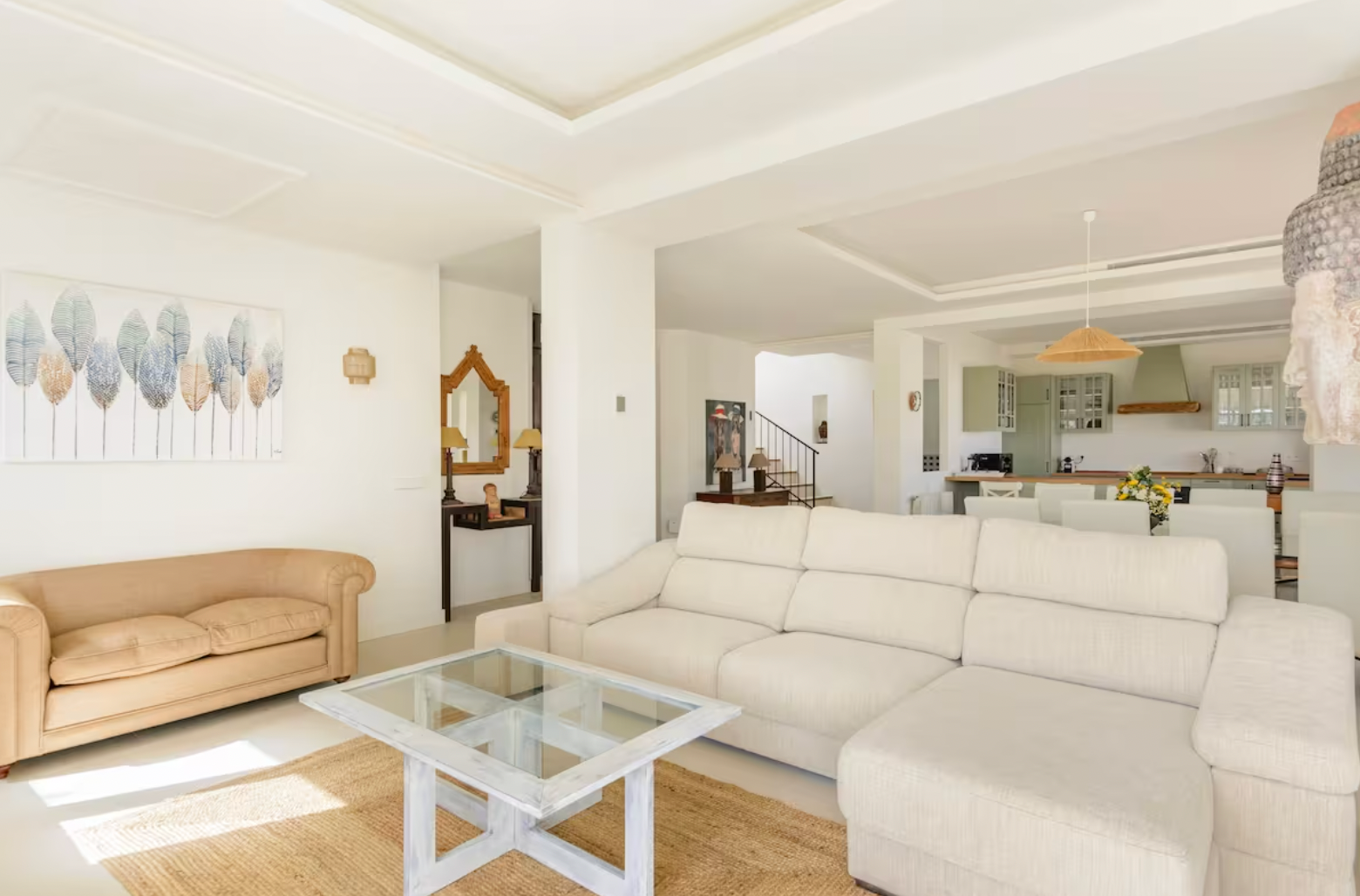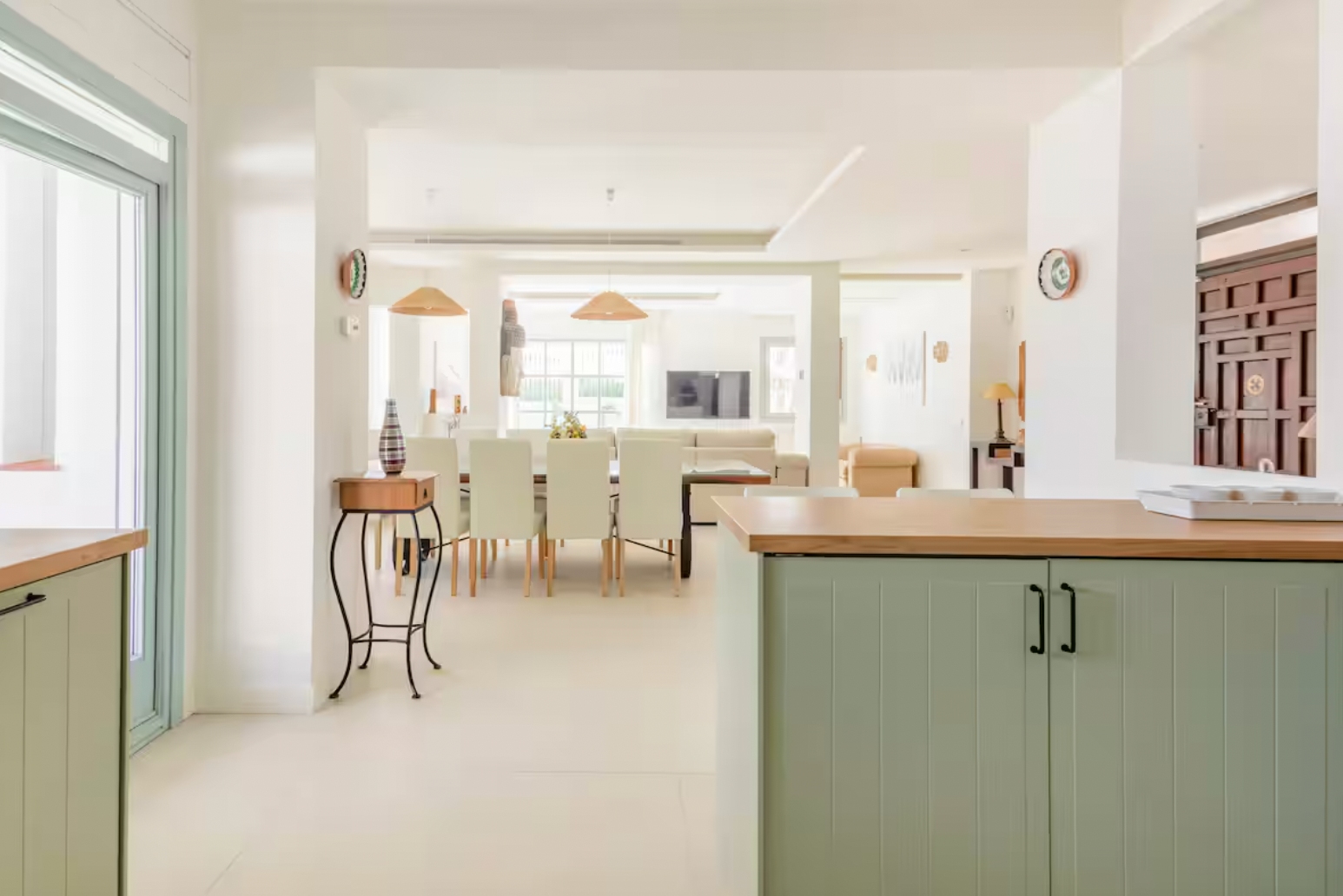 Step inside and be greeted by a bright and airy living area, elegantly furnished with soft neutral tones and stylish décor. The open-plan design seamlessly connects the living and dining spaces, leading to a fully equipped kitchen with sleek cabinetry, wooden countertops, and high-end appliances—ideal for cooking and entertaining.