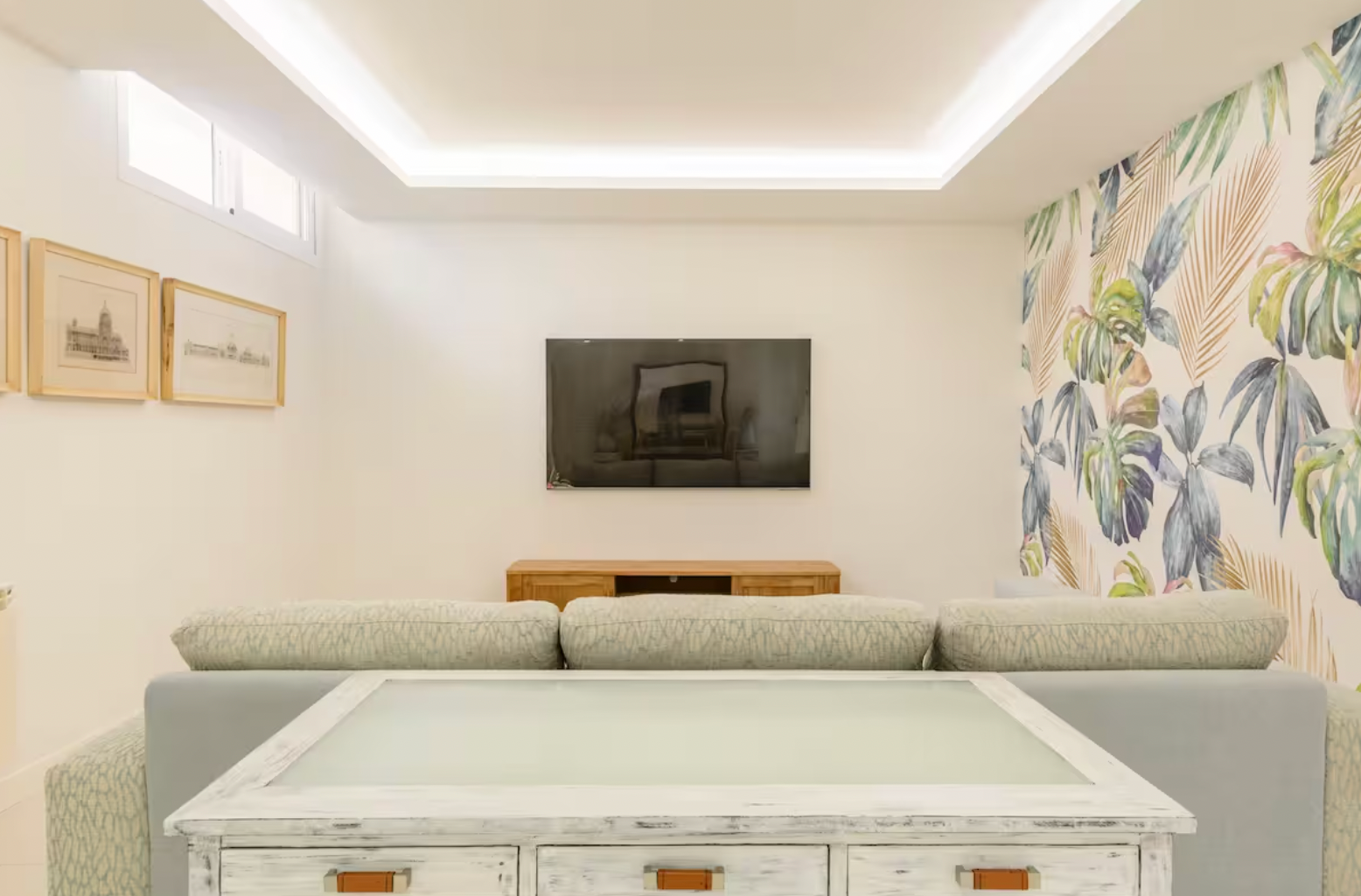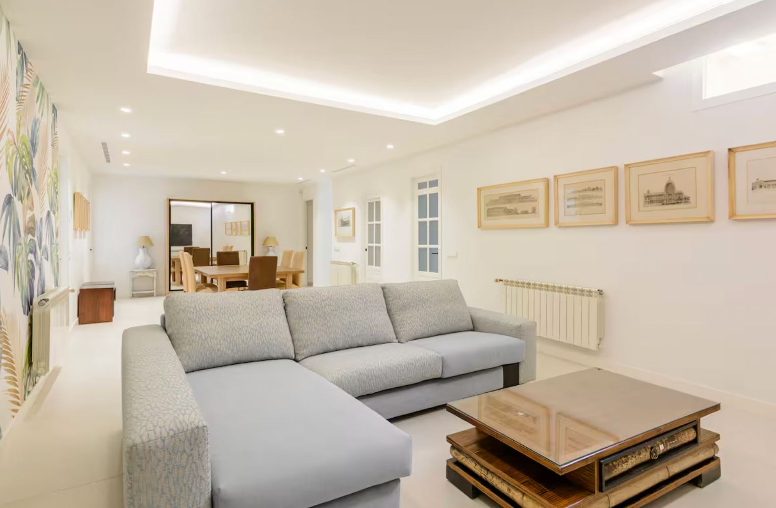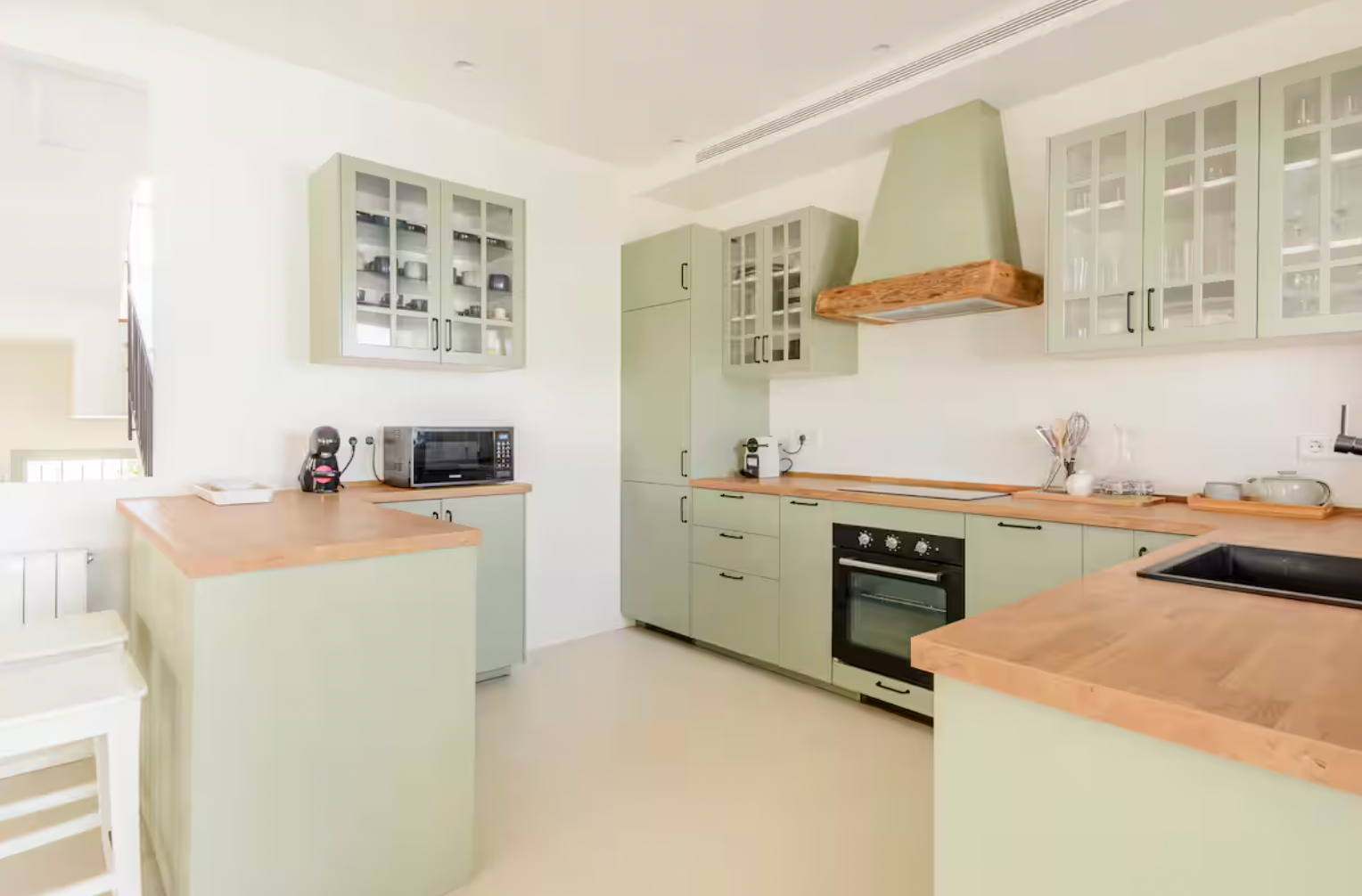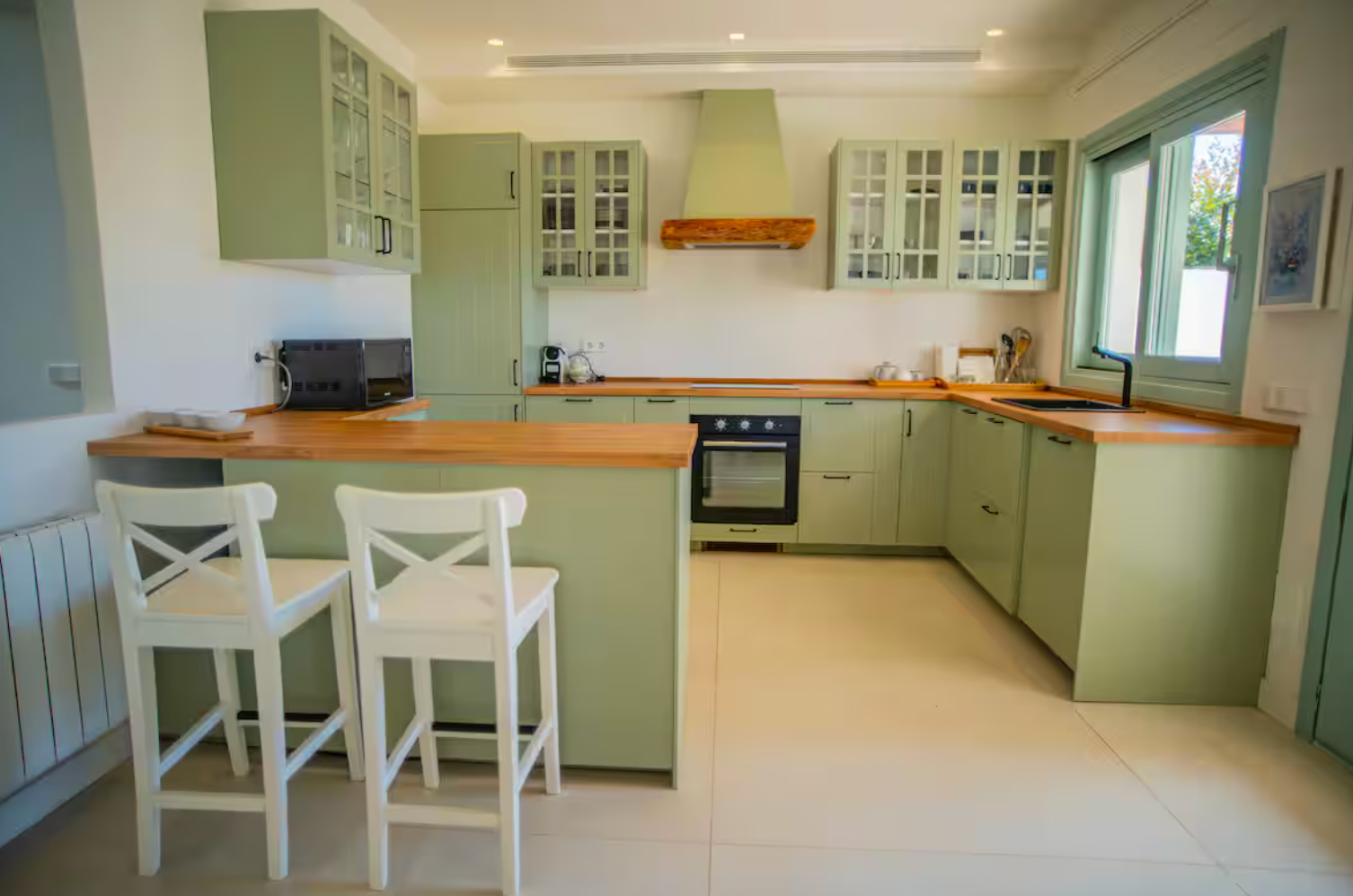 Step inside and be greeted by a bright and airy living area, elegantly furnished with soft neutral tones and stylish décor. The open-plan design seamlessly connects the living and dining spaces, leading to a fully equipped kitchen with sleek cabinetry, wooden countertops, and high-end appliances—ideal for cooking and entertaining.