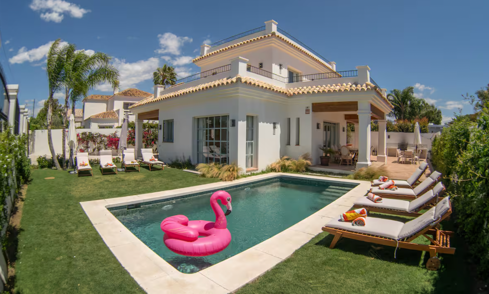 Enjoy the Mediterranean lifestyle in the villa’s private outdoor space. Take a refreshing dip in the swimming pool, relax on the sun loungers, or gather around the BBQ area for al