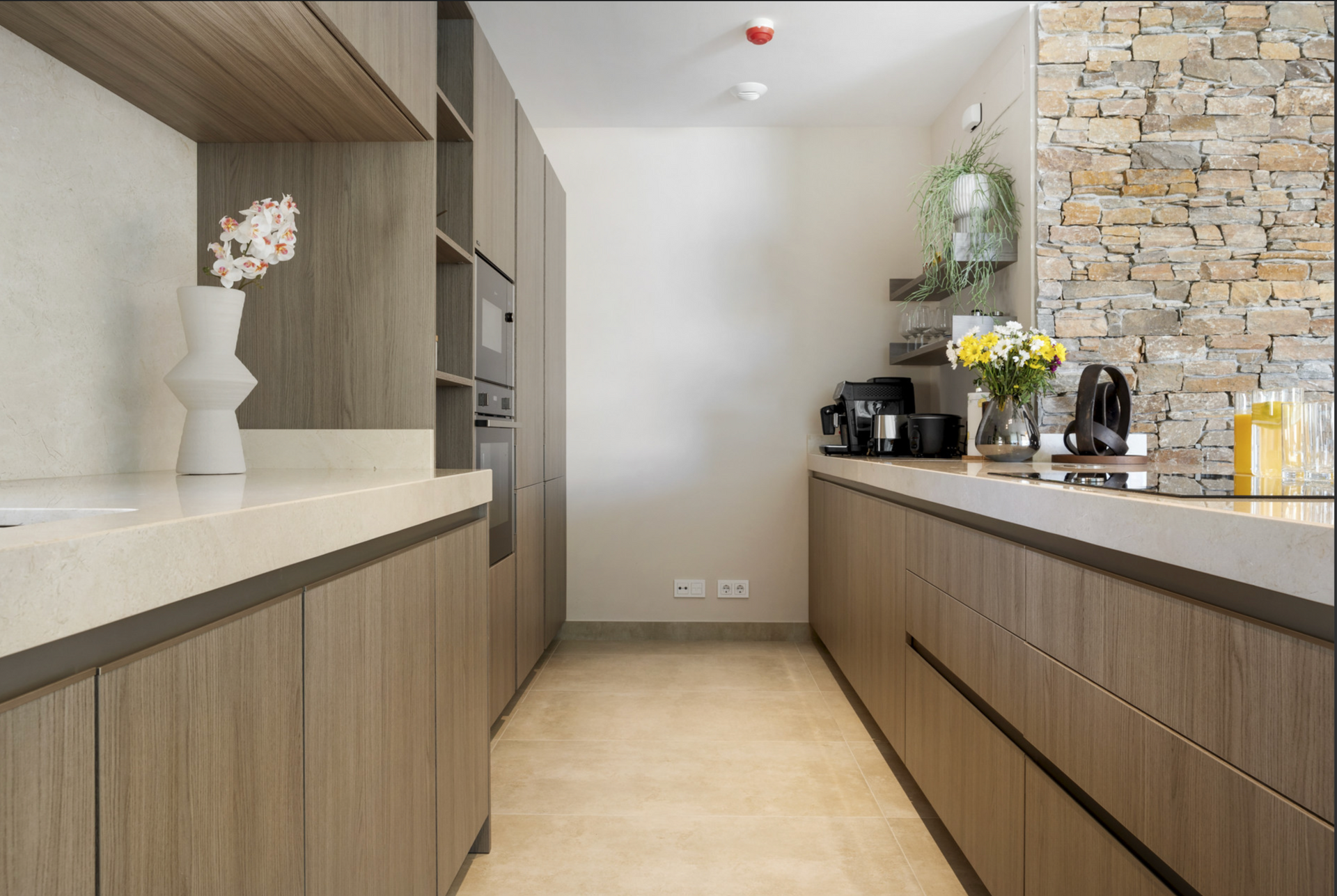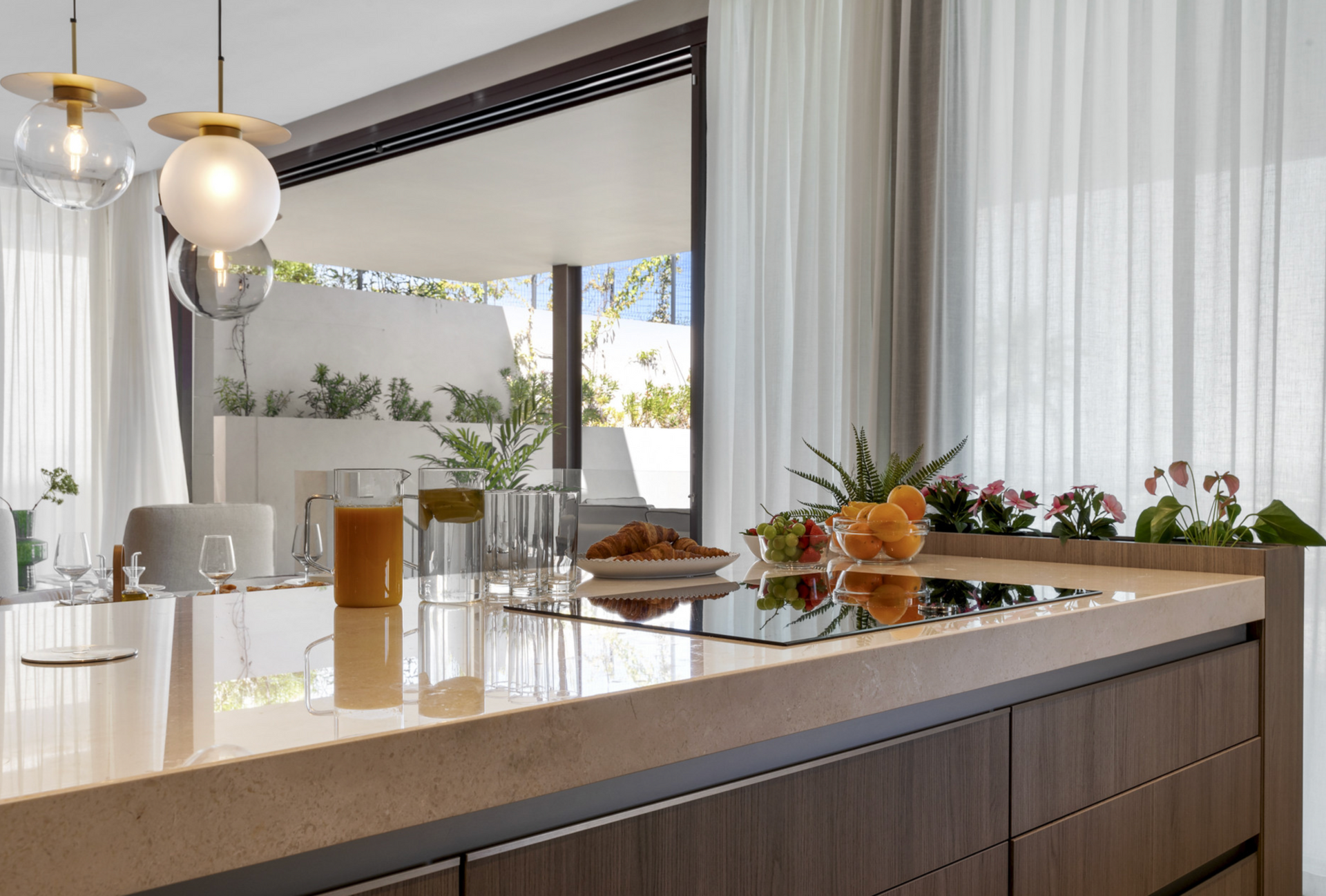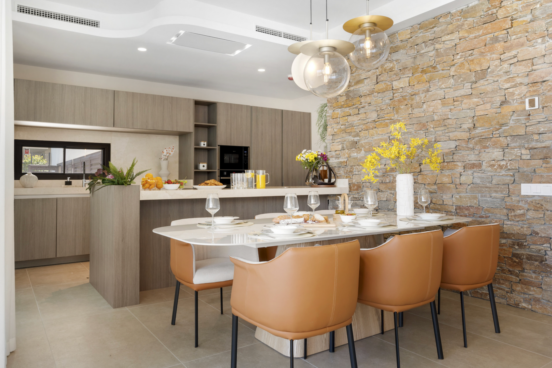 Inside, the villa is flooded with natural light. The main floor features an open-plan living area with sleek, modern finishes, and a fully equipped kitchen that flows out onto a sun-drenched terrace and private pool—perfect for al fresco dining and lazy afternoons.