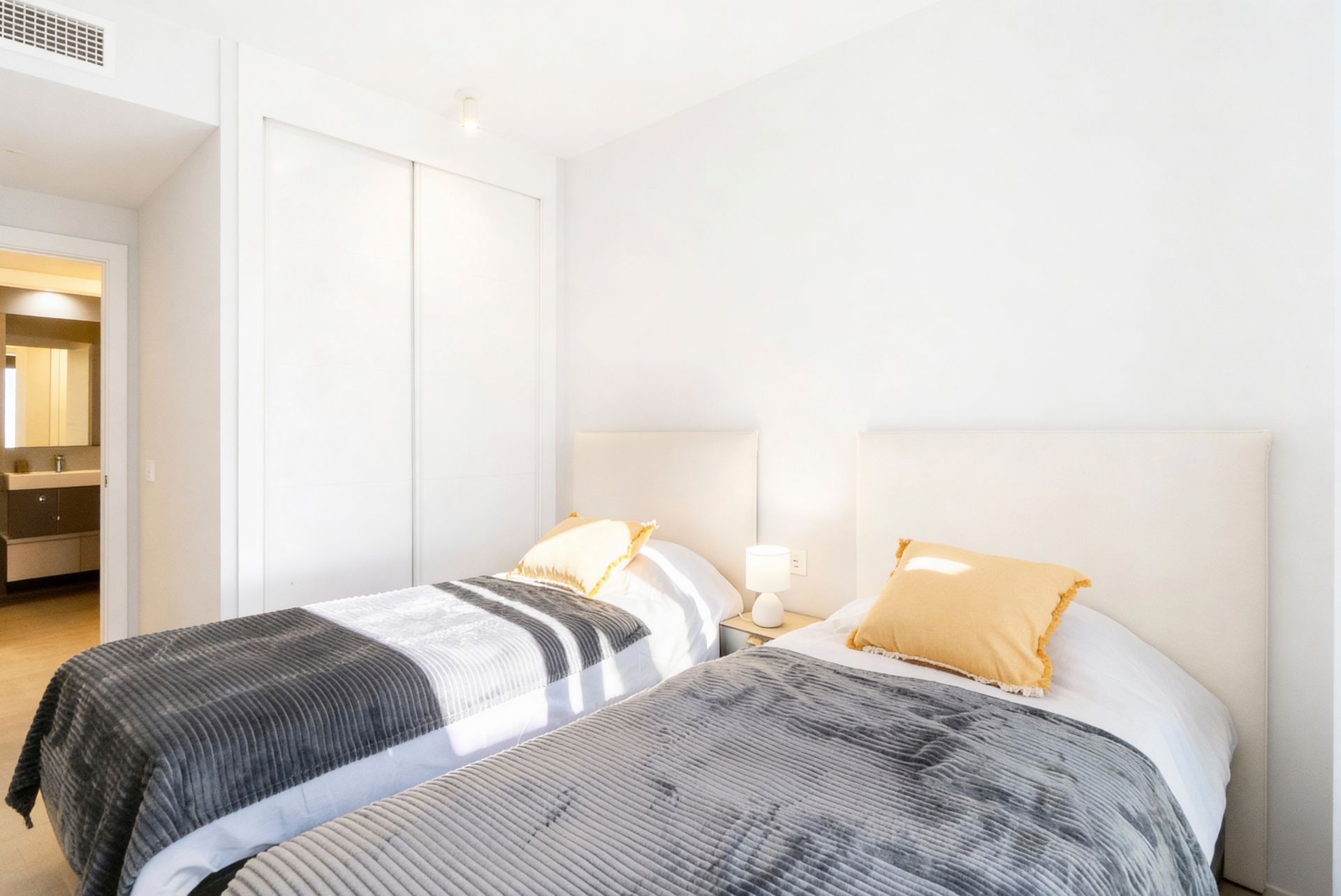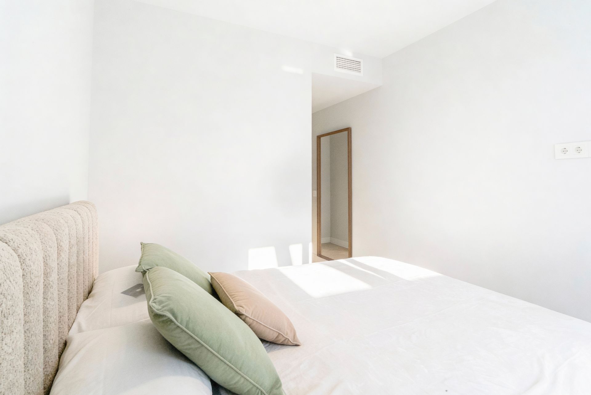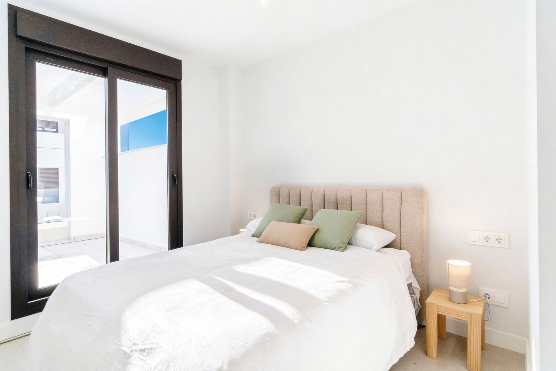 Floor-to-ceiling windows with shutters and blackout curtains ensure excellent natural light during the day and comfortable, restful sleep at night. The décor is modern and calm, with soft neutral tones, natural wood finishes, and carefully selected lighting that creates a warm, upscale atmosphere throughout.