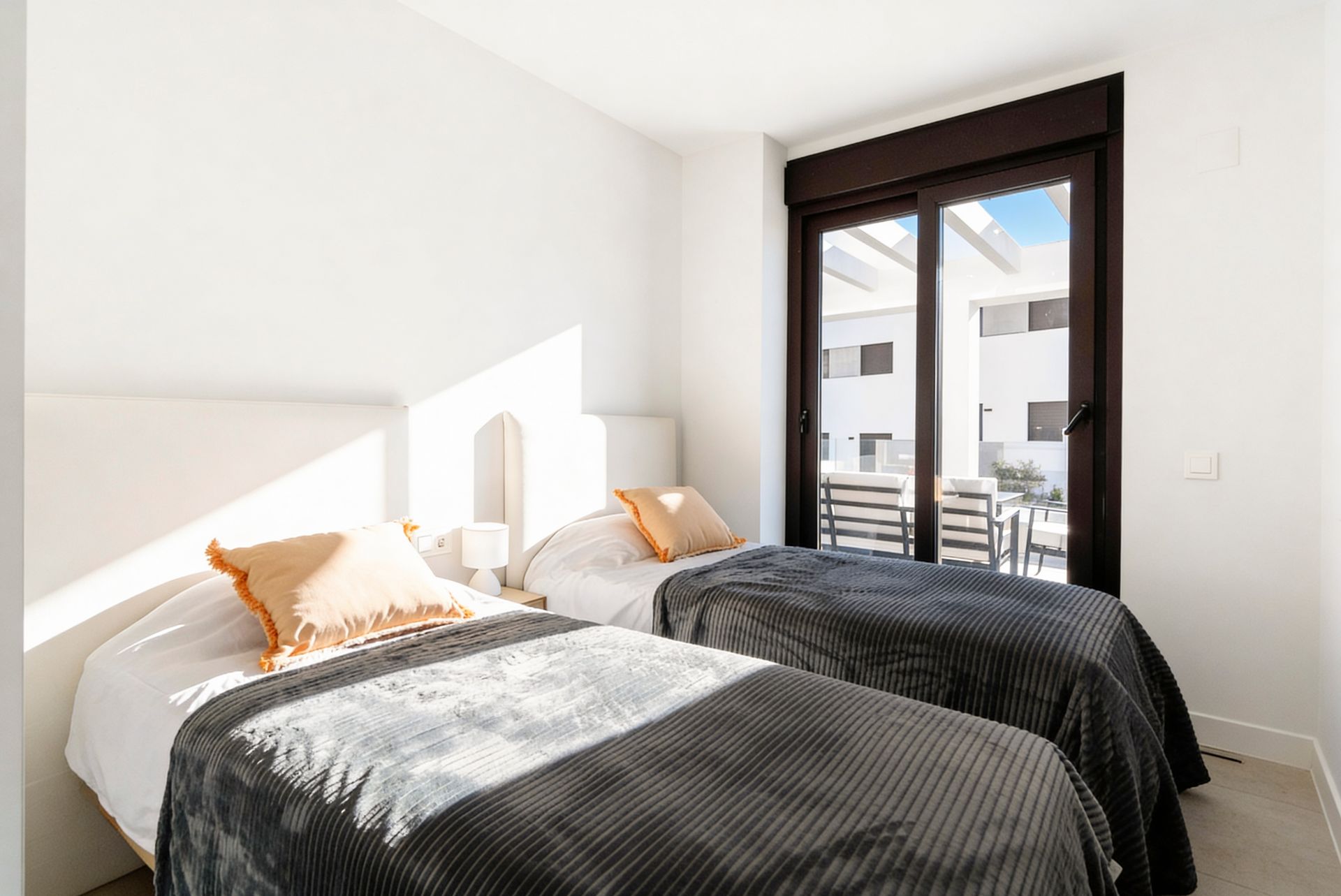 The apartment features two beautifully furnished bedrooms and two modern bathrooms, making it ideal for families, couples, or friends. The main living area is bright and elegant, with an open-plan kitchen and lounge finished with high-quality, contemporary furniture. The space opens onto a large south-facing terrace with a lovely view of the swimming pool, perfect for relaxing, dining, or enjoying the sun.