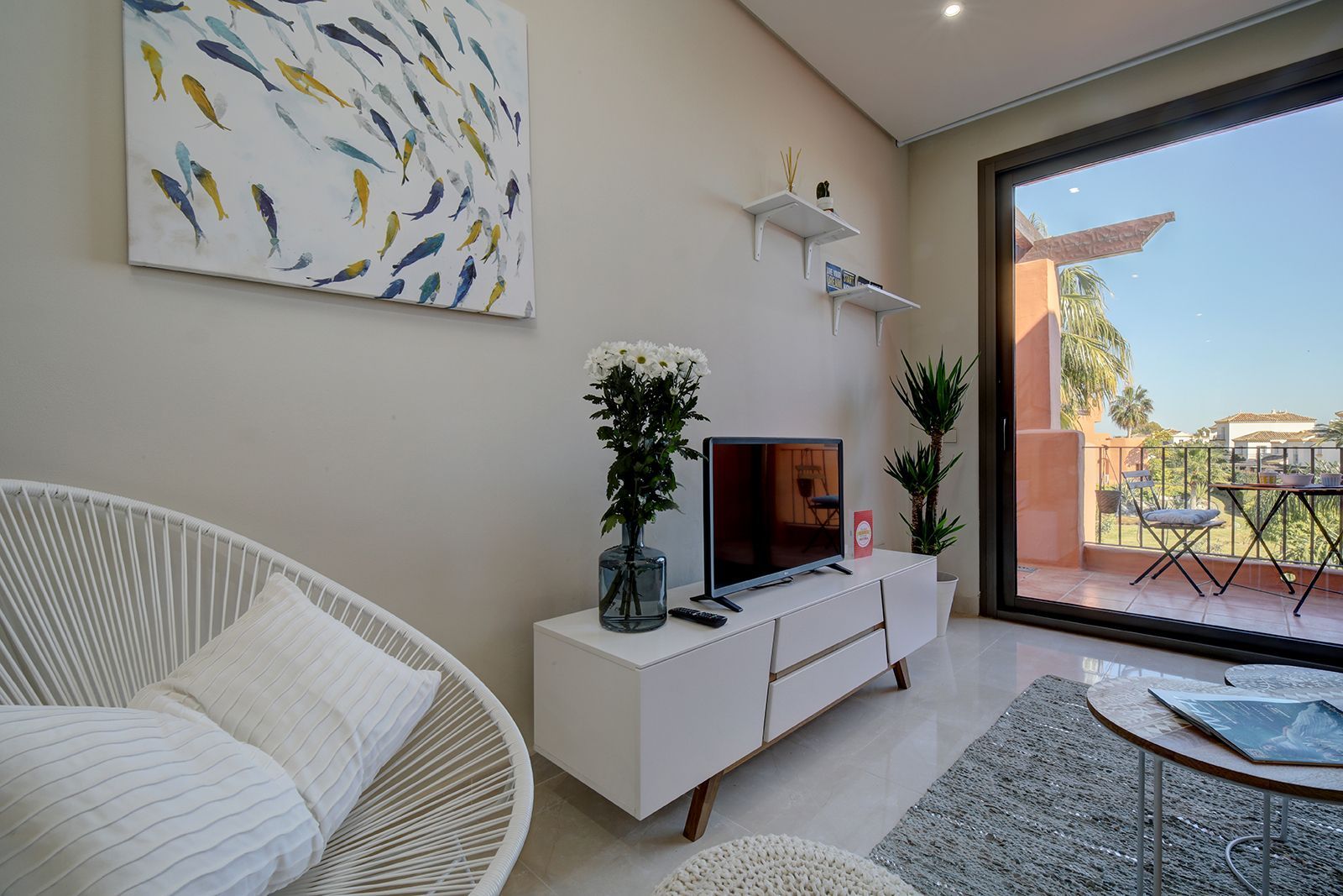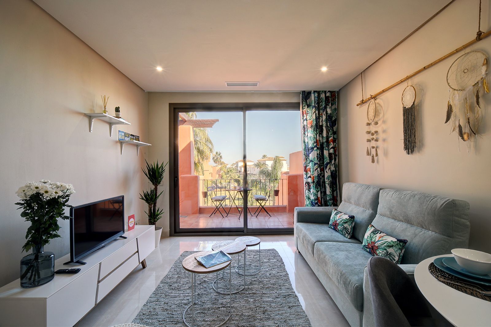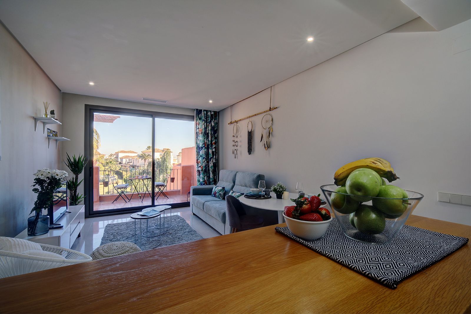 Our apartment is styled with a vibrant tropical flair, perfectly complementing the modern Andalusian architecture of the complex. Thoughtfully decorated to high standards and in line with current designer trends, this fully equipped one-bedroom getaway offers a comfortable and stylish setting for your holiday.
